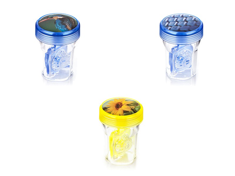 Visok etui je idealen za shranjevanje in kemično dezinfekcijo vaših kontaktnih leč. S svojo obliko, uporabo in barvitostjo pritegne in razveseli, prozorna posodica in originalna slika na pokrovčku zagotovo pritegneta pozornost. Izberite iz celotne palete motivov in barv.