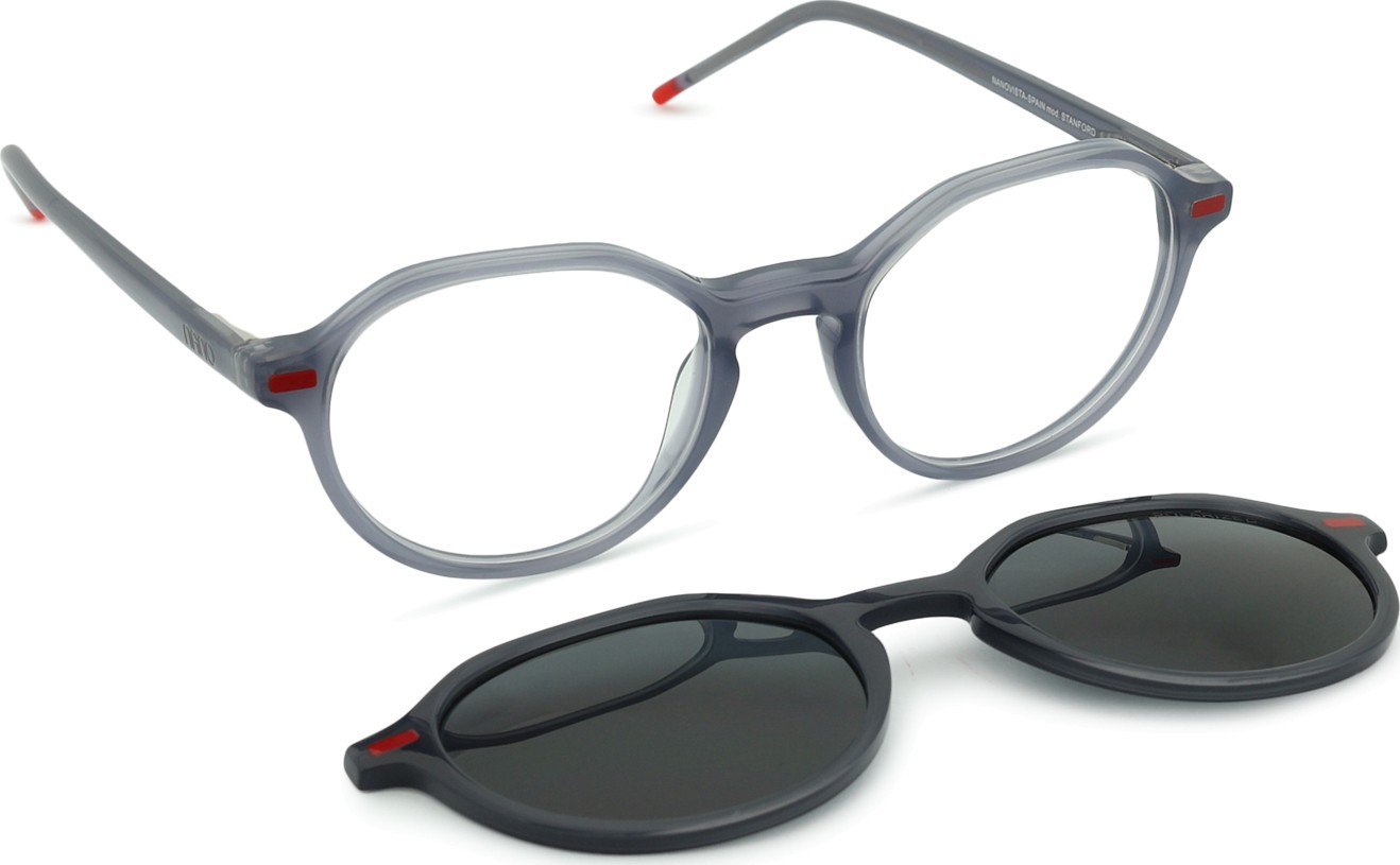- Del očal je tudi dodaten sončni klip, ki se enostavno pritrdi na okvir očal in tako takoj dobite sončna očala. Klip s svojo izvedbo in dizajnom odlično posnema obliko okvirja, njegova namestitev pa je zelo hitra in enostavna. V primeru višjih plus dioptrij pa je potrebno izbrati stanjšano varianto očalnih leč, da se klip ne dotika sprednje sferične površine leč in tako pravilno sedi na okvirju.