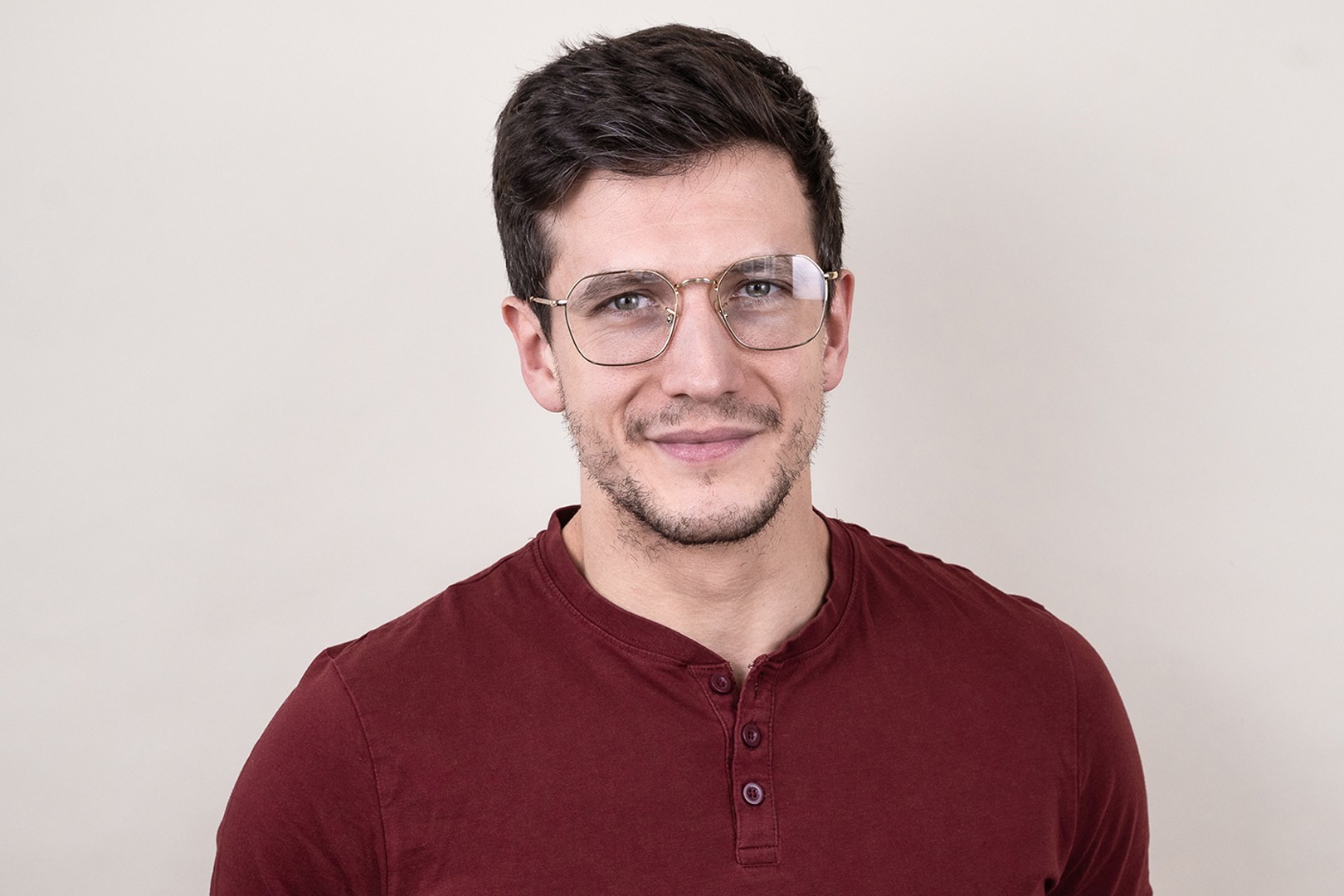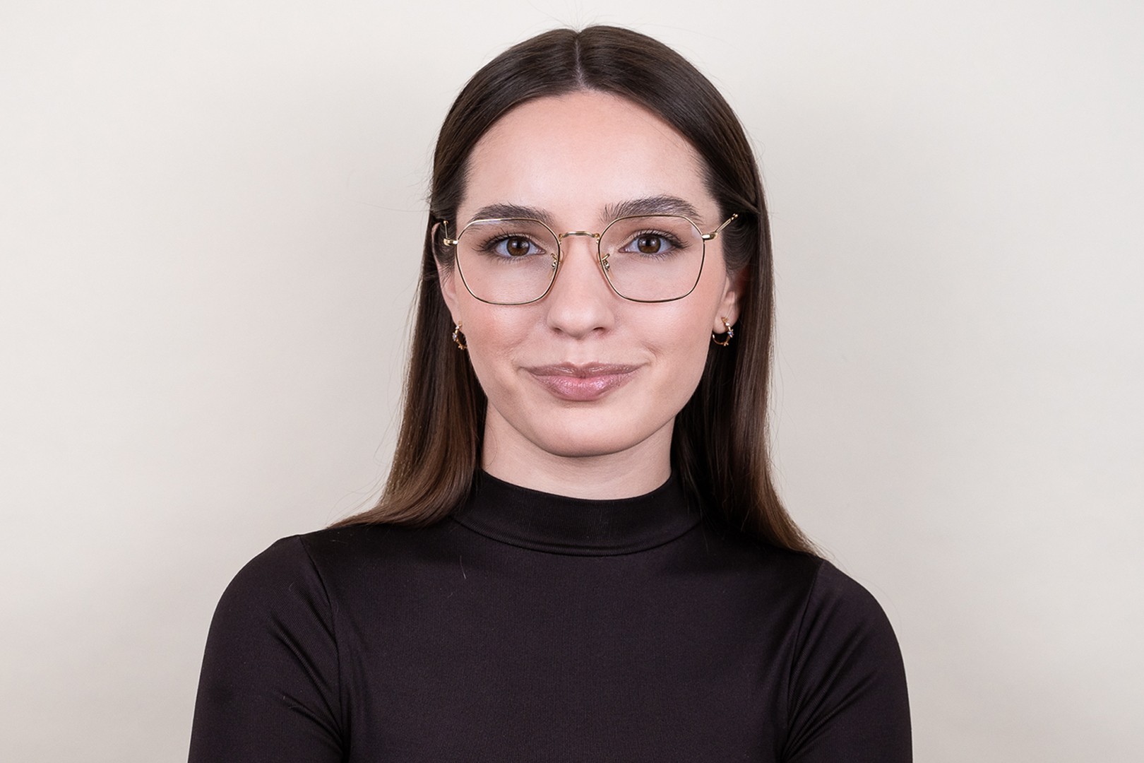 Zlata barva okvirjev se odlično ujema s toplim tonom kože ter s temno rjavimi lasmi.