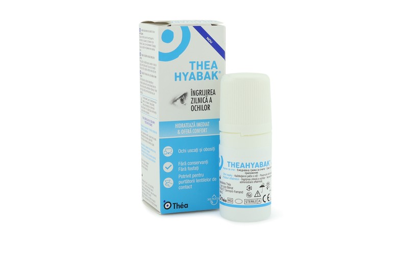 Vlažilne in zaščitne kapljice TheaHyabak prinašajo olajšanje za utrujene, razdražene in suhe oči. Vsebujejo učinkovino natrijev hialuronat in so zaradi sestave brez konzervansov primerne tudi za občutljive oči. Hipotonična sestava kapljic pomaga pri boljši hidraciji oči, zaradi česar se je mogoče hitreje in učinkoviteje znebiti neprijetnih simptomov, katerih najpogostejši vzrok je sindrom suhega očesa.